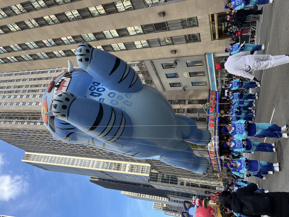 A vibrant scene depicts a blue tiger-like balloon floating above a parade. High-rise buildings form the backdrop, with clear blue skies visible. People in blue and white uniforms are marching along the parade route. The "Radio City" sign is visible in the background. Other details include street signs and store fronts like "Warby Parker" and "Arabica." The scene captures a festive and urban atmosphere.