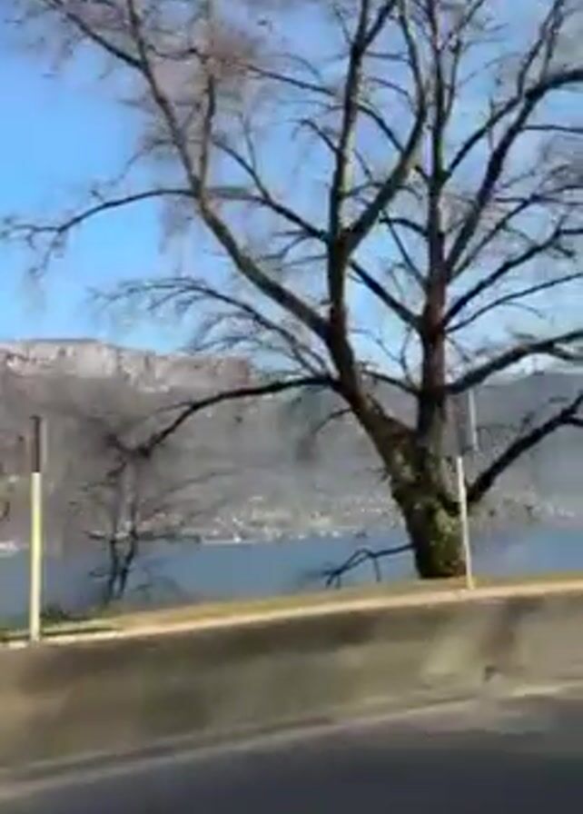 view from a moving vehicle driving along a highway or road. The road is bordered by a concrete barrier wall. On the other side of the wall is a lake or large body of water, with mountains in the distance under a clear blue sky. A few trees with bare branches are in the foreground. The lighting suggests it is daytime. The camera movement is consistent with the motion of the vehicle. The overall atmosphere is bright and scenic.