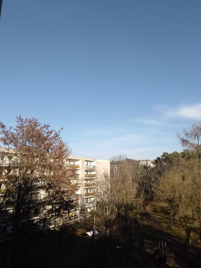 The image captures an outdoor urban-forested landscape, likely situated in Dresden, Germany, specifically featuring "Plattenbau" residential architecture. The scene is illuminated by strong sunlight under a clear, bright blue sky with faint cirrus clouds near the horizon on the right and a distant aircraft contrail in the upper left-center. In the mid-ground on the left, a multi-story (approximately seven visible floors) apartment building, consistent with "Plattenbau" construction, stands. Its facade is light-colored (off-white or light beige) with numerous balconies featuring light yellow or orange railings. Windows appear dark, reflecting the environment or interior shadows. This building is partially obscured by the dark, bare branches and sparse brown foliage of a large deciduous tree in the immediate foreground. To the right of the apartment building and extending into the background, a dense wooded area or forest dominates, composed primarily of bare deciduous trees, indicative of late autumn, winter, or early spring. Some darker coniferous trees are also visible within this expanse. In the far background, amidst the trees, several distant, low-rise buildings with flat roofs can be observed. The immediate foreground and lower right portion of the image are heavily shadowed by surrounding trees, presenting a dark ground surface. Within this shadowed area, the wooden and metal components of a children's playground structure, including a slide and a ladder, are partially discernible. No individuals or active interactions are visible within the scene. The lighting suggests mid-morning or late afternoon, characterized by long shadows extending towards the viewer from the upper right.