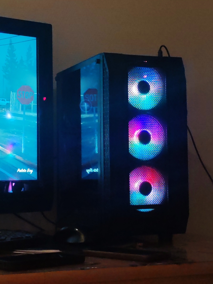 This image depicts a computer setup positioned on a wooden desk within an indoor environment in Hoenheim, France. On the left, a black computer monitor displays a vibrant blue-toned scene from a video game. Visible on the screen are a red "STOP" sign, several evergreen trees, and a white vehicle. The text "Paleto Bay" is present in the lower-left portion of the monitor's display. To the right of the monitor stands a black desktop computer tower. This tower features a transparent side panel, which reflects the "STOP" sign and "Paleto Bay" text from the adjacent monitor. The front panel of the computer tower is equipped with three circular cooling fans, each emitting dynamic, multi-colored RGB lighting in shades of blue, cyan, pink, and red. In the foreground, on the wooden desk surface below the monitor and computer tower, a dark-colored computer mouse is visible. The background wall is a plain, light-colored surface. The primary illumination in the scene emanates from the monitor and the RGB fans of the computer tower.