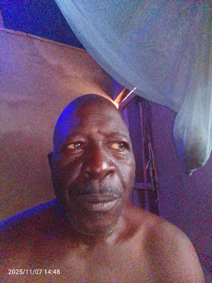 The image captures an indoor scene depicting a single adult male, appearing middle-aged to elderly, with dark skin, a bald head, and a mustache and goatee