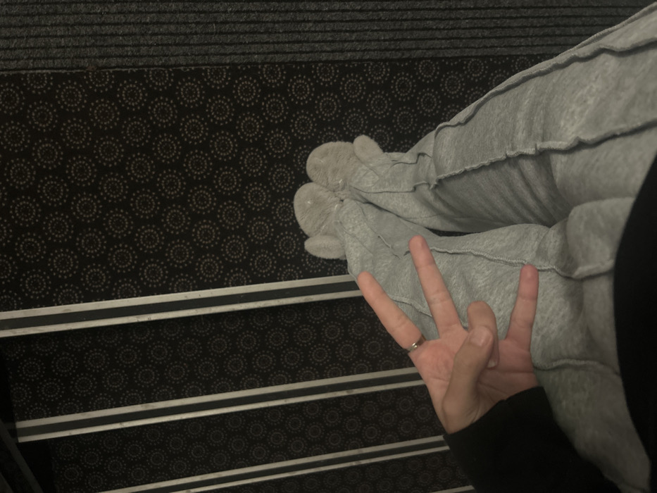 The image displays a first-person, downward-facing perspective of an individual's lower body and left hand, situated indoors in the city of Unknown, Unknown. The individual's left hand, wearing a ring on the ring finger, is positioned in the center-left, with the index and middle fingers extended in a "V" gesture. The lower torso and legs are clad in light gray sweatpants, characterized by prominent vertical exposed seam detailing. The feet are covered in light grey, plush, slipper-like footwear. The background floor is predominantly dark carpet featuring a repeating pattern of small, light-colored, dotted concentric circles. Multiple parallel, dark stripes with light edges, consistent with stair nosings, are visible on the left side of the frame. A contrasting section of dark gray, vertically textured carpet runs along the right edge.