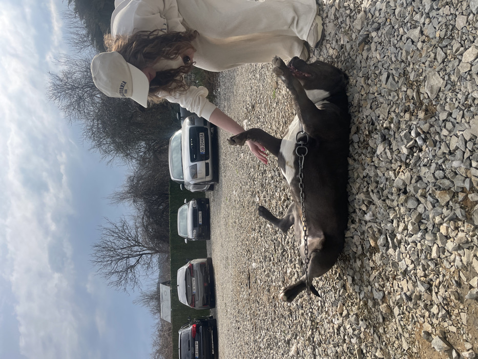 The scene takes place outdoors in the city of Ugarchin, Bulgaria, on a gravel-covered ground. One female individual is visible, bending forward. She has long, wavy brown hair and is wearing a beige baseball cap with "CALIFORNIA USA" embroidered on the front, a matching long-sleeved top, and wide-leg pants, with light-colored athletic shoes. Her right hand is extended downwards, making contact with a dog. The dog, a dark-colored canine with white markings on its chest and underbelly, is lying on its back on the gravel, with its legs raised and mouth slightly open. It wears a metal chain collar from which a leash chain extends towards its hind legs. In the background, four vehicles are parked on the gravel: a black Audi station wagon (license plate OB 2277 BP), a grey BMW M-series sedan (OB 3423 BC), a dark-colored Audi sedan (OB 0085 BA), and a silver Audi TT coupe (OB 2044 BA). Behind the vehicles, there is a low green barrier or hedge, backed by several bare deciduous trees and bushes. The sky is partly cloudy with patches of blue visible.