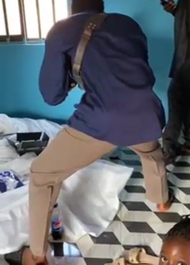 A man in a blue shirt and khaki pants is standing on a bed, facing a window. He has a strap across his chest, possibly for a camera or gear. There is a bottle of Pepsi on the bed, along with other items covered by a white sheet. The room has a black and white checkered floor. Another person is standing to the right of the man, partially out of frame, holding a phone. A woman and a child are in the foreground, looking up towards the camera. The walls are light blue. The man appears to be taking pictures or recording something outside the window.