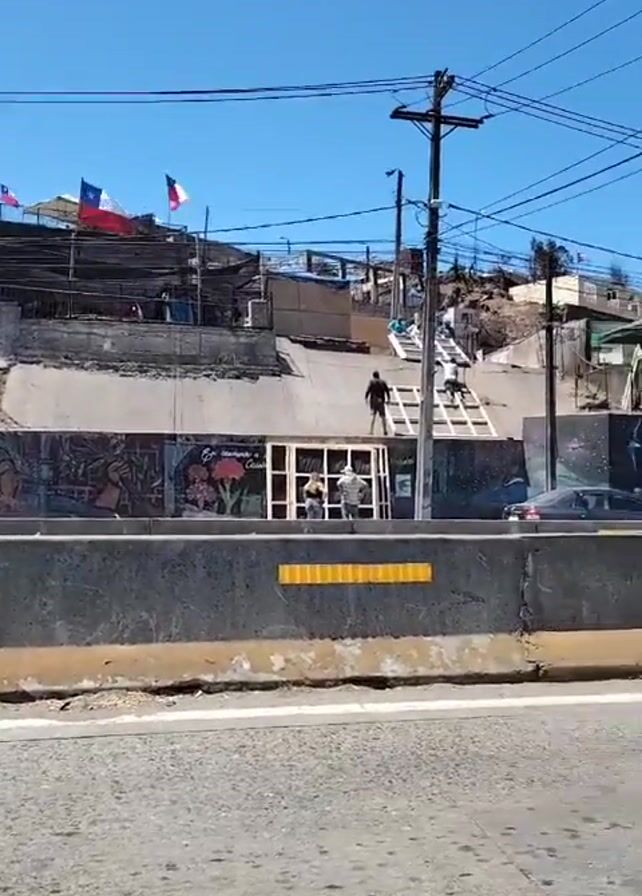 construction site on the side of a road. A low concrete barrier separates the road from the site. A white pickup truck passes by the camera. Three individuals are visible at the site. Two stand near what appears to be a door or window frame, while the third walks along a ramp or stairs constructed on the slope leading up the hillside. Chilean flags are visible above. Overhead, power lines stretch across the blue sky. The video's focus is on the construction activity and the surrounding environment.