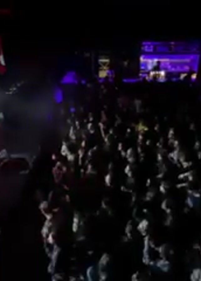 dimly lit concert venue with a band performing on stage in the far left corner. Red stage lights illuminate the performers, casting long shadows. A crowd of people fills the venue, facing the stage, their shapes mostly indistinct in the low light. Stage lights behind the band add a purple and blue glow to the background. The camera perspective appears to be from an elevated position, possibly a balcony or raised platform. The overall atmosphere suggests a live music event with an energetic crowd and dynamic stage lighting.