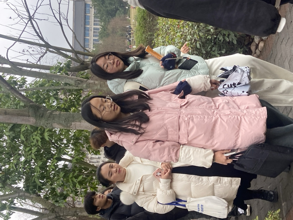 A group of people stand outside on a cloudy day. The central focus is on three women wearing winter coats. One is wearing a light blue coat and glasses, another a pink coat and glasses, and the third a white coat. They are positioned near trees and greenery, with glimpses of a building in the background. Some are holding bags. The general atmosphere suggests a casual outing or gathering.