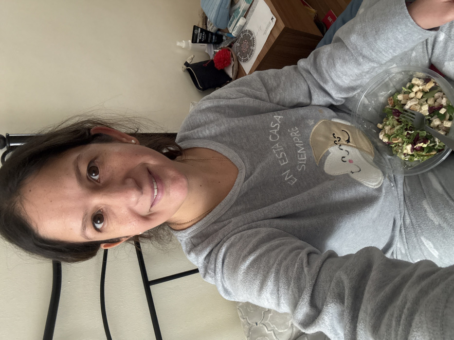 A single adult female, estimated to be between 30 and 40 years of age, is depicted seated on a bed in an indoor residential setting. She has dark brown hair and eyes, with a visible mole superior to her left eyebrow, and is smiling directly at the camera. She wears a grey long-sleeved pajama top and matching bottoms. The pajama top features an embroidered graphic of a white cloud and a beige crescent moon with anthropomorphic faces, embracing, positioned below the embroidered Spanish text "EN ESTA CASA SIEMPRE" (In this house always). She holds a clear plastic container containing a salad composed of green leafy vegetables, radicchio, diced white protein, and nuts, with a silver-colored fork inserted. Behind her is a black metal headboard with vertical and horizontal bars. To her right, a light-colored wooden nightstand is situated against a plain beige wall. Items observed on the nightstand, from left to right, include: a black cosmetics bag, a red spherical bath pouf or scrubber, a white pump-spray bottle, a black tube labeled "Face Mud Mask," a light blue box, a circular coaster with a mandala design resting on a white document, and a white rectangular box. The specific geographic location within Madrid, Spain, cannot be ascertained from the visual evidence presented.