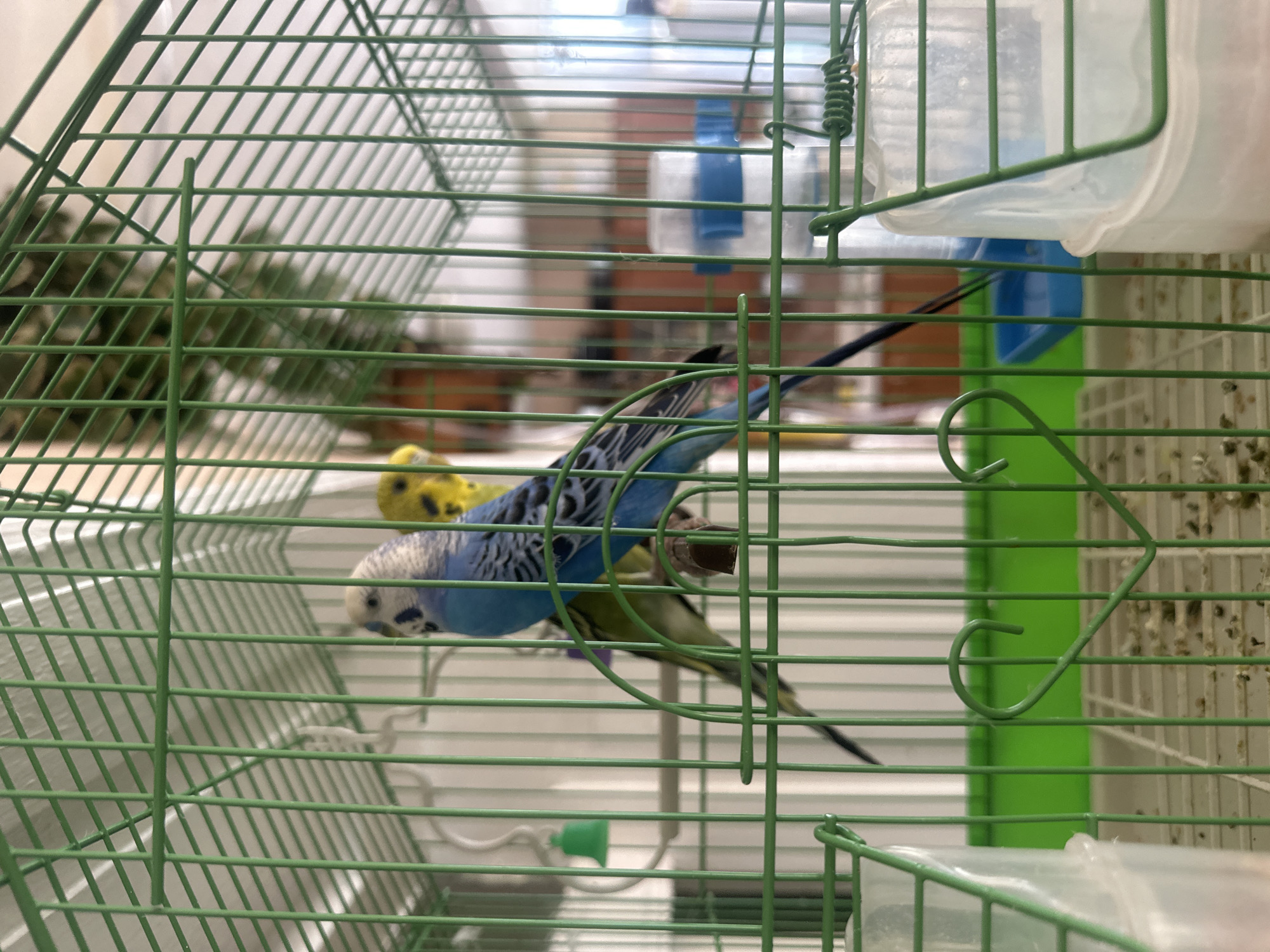 A vertical photograph depicts the interior of a green wire birdcage containing three budgerigars
