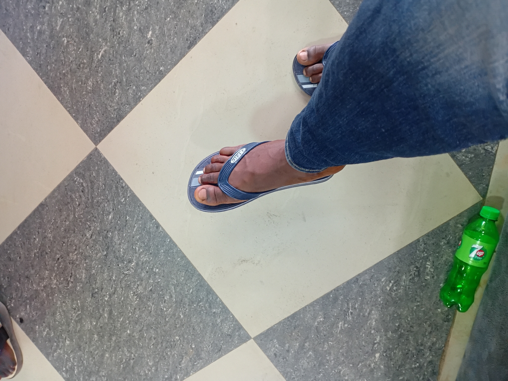 The image presents an overhead view of a tiled floor in Dorayi, Nigeria. The flooring displays a diagonal checkerboard pattern of light beige and dark grey speckled tiles. The lower legs and feet of an individual are centrally visible, clad in blue denim jeans and blue and grey flip-flops, one strap marked 'ONEILL'. The individual has dark skin. A green plastic bottle of 7 UP Free lies horizontally on the floor in the bottom-left corner. A dark-colored shoe or sandal is partially visible in the upper-left corner.