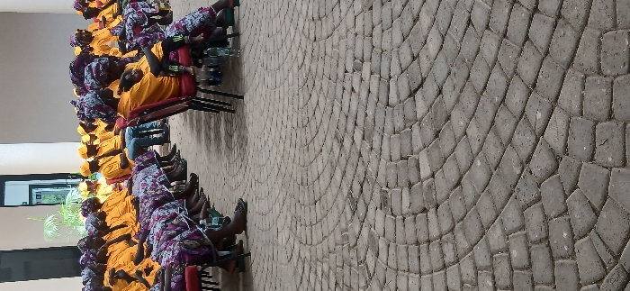 The image depicts an outdoor gathering of approximately 50 individuals, primarily adults, seated on red plastic chairs in Unguwan Sanusi, Nigeria. The ground in the foreground and midground is paved with grey interlocking paver stones arranged in a distinct circular pattern. Most attendees are dressed in uniform yellow short-sleeved shirts; females additionally wear patterned purple and white skirts or dresses and matching head wraps, while several males wear yellow baseball caps. One female figure in the right foreground holds a small child on her lap. Multiple small plastic water bottles are visible on the ground near the seated individuals. In the background, a light-colored building with a large dark-framed glass entrance and an interior potted plant is partially visible. The individuals are generally oriented forward, suggesting attention towards an unseen focal point beyond the frame.