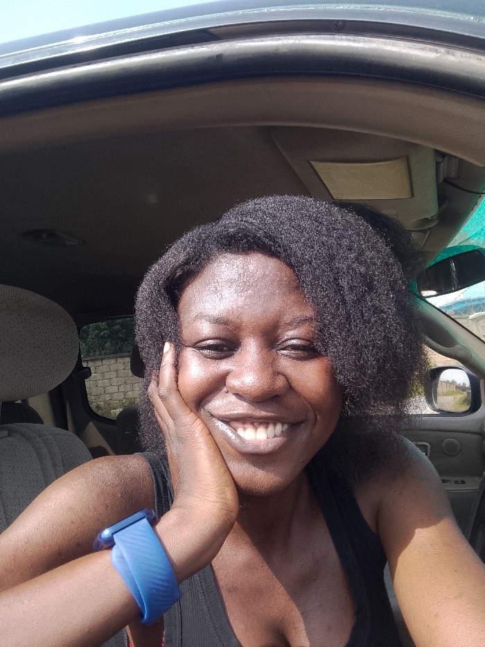The scene depicts a single adult female smiling broadly, with her right hand resting against her right cheek, inside a vehicle in Kurudu, Nigeria, during daylight hours