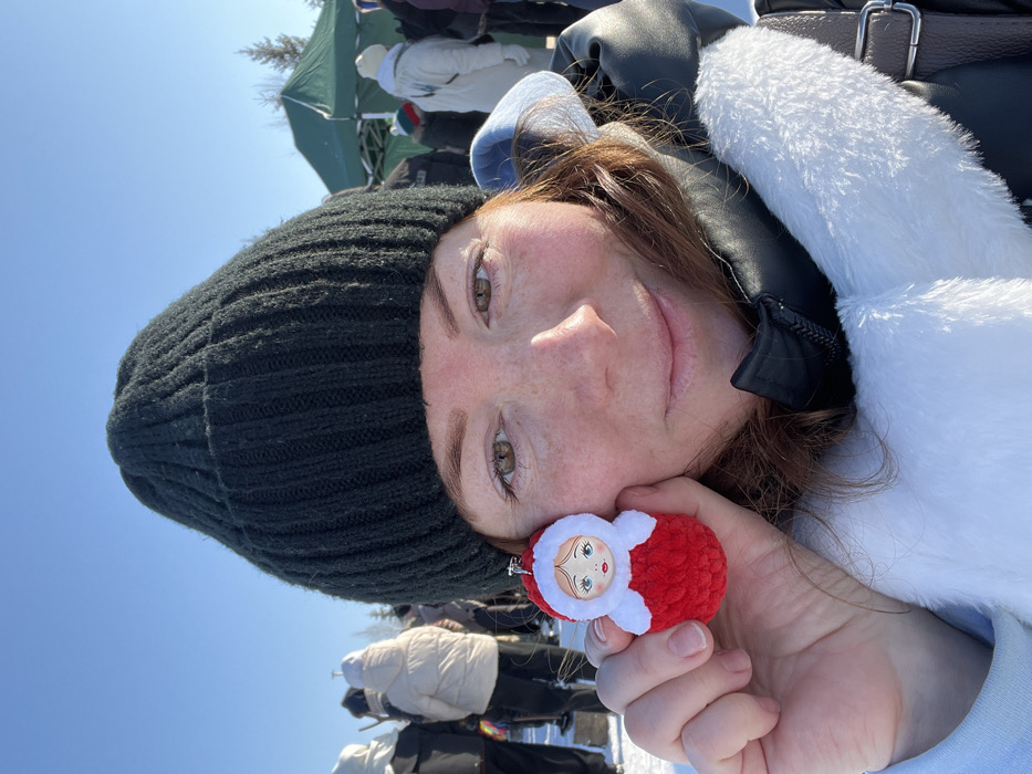 In Ludorvay, Russia, an outdoor selfie captures a fair-skinned adult female, appearing to be in her 30s or 40s, with reddish-brown hair and light freckles, smiling slightly while looking directly at the camera. She wears a dark green/black ribbed knit beanie and a black winter jacket with a white faux-fur collar/trim visible on her right shoulder. In her left hand, held up near her face, she presents a small, crocheted keychain resembling a traditional Russian doll. The doll is primarily red with a white hooded top, featuring a painted face with blue eyes and light brown hair. The background consists of a blurred crowd of individuals dressed in various winter attire, including white and black coats, standing on a snow-covered ground under a clear, bright blue sky. A dark green canopy tent and evergreen trees are visible in the middle ground to the right. The scene is illuminated by strong, direct sunlight.