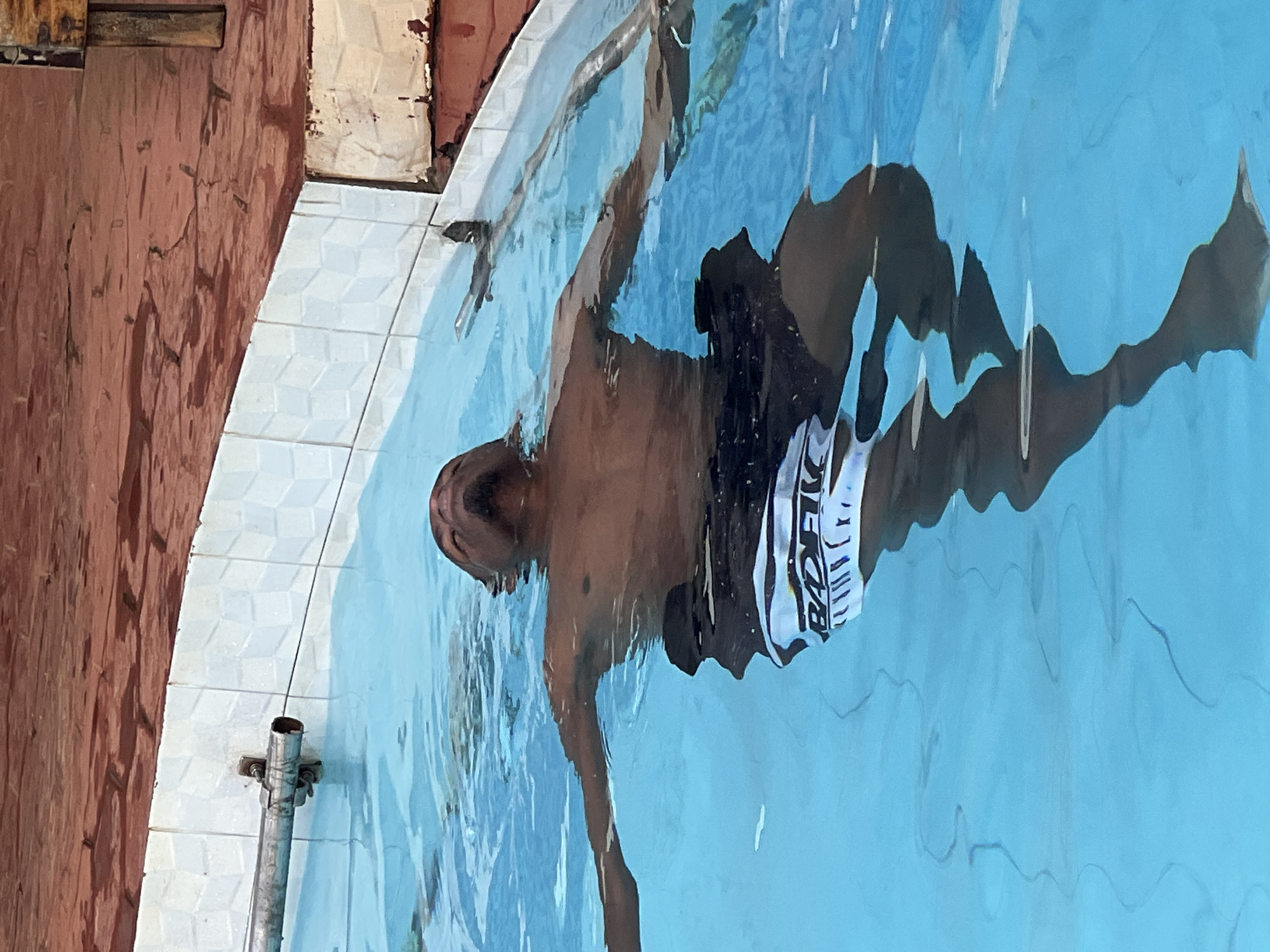 An adult male with dark skin and a short beard is depicted floating on his back in a swimming pool located in Nyeri, Kenya