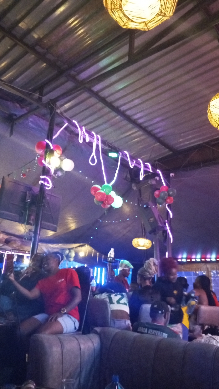 A lively bar or club scene unfolds under a corrugated metal roof adorned with neon lights and spherical wicker lamps