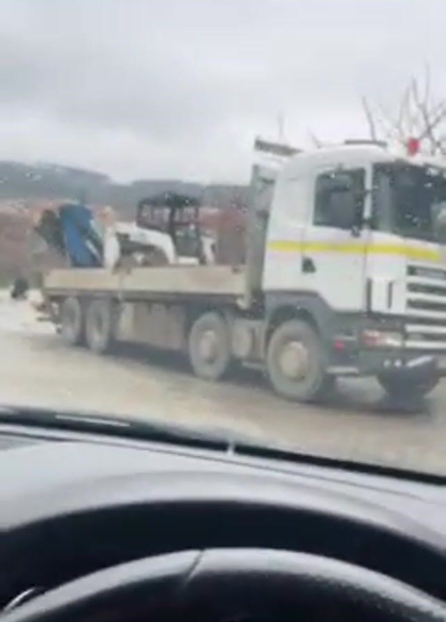 view from inside a car, looking out at a rainy day. A large, white flatbed truck with a blue bobcat on it is parked on the side of the road. The car is driving on a wet road past the truck. A green van is seen in the distance. The dashboard of the car is visible, including the steering wheel, instrument cluster, and infotainment screen. The car appears to be driving slowly.