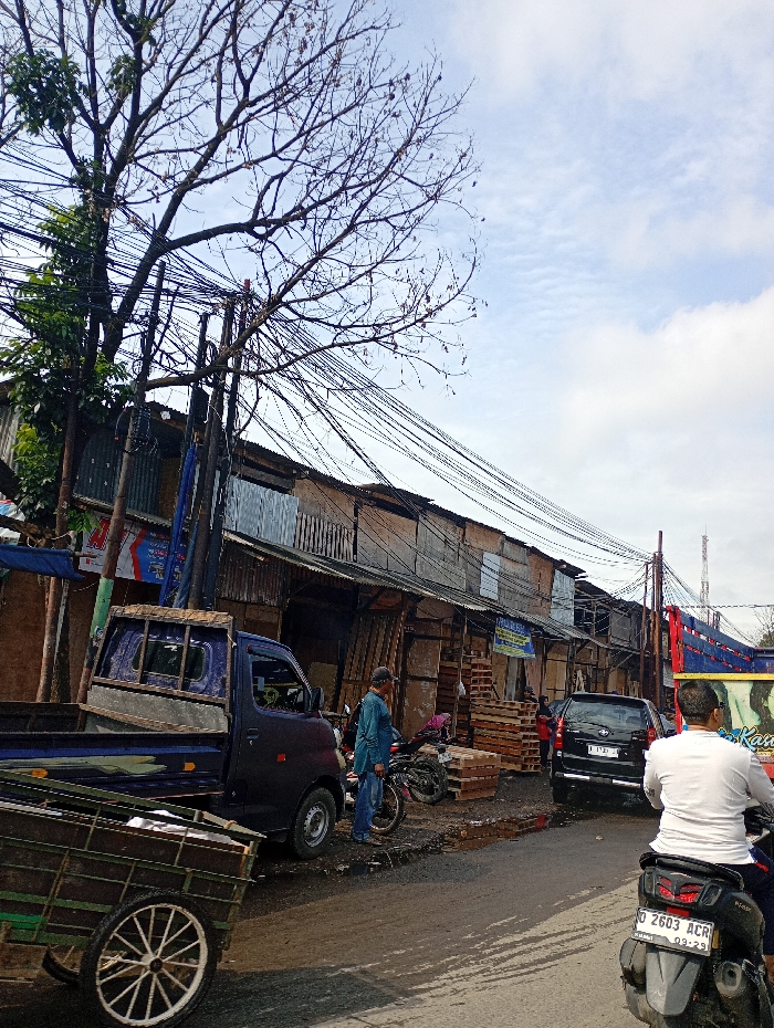 A street scene with a small blue pickup truck and a two-wheeled cart. A man in a blue shirt stands near the truck. Wooden boards and a motorcycle are visible next to the vehicle. A black car follows a man on a scooter in the street. Overhead, a dense web of power lines spans between utility poles above buildings with corrugated metal roofs. A tall, bare tree stands at the left. The sky is overcast.