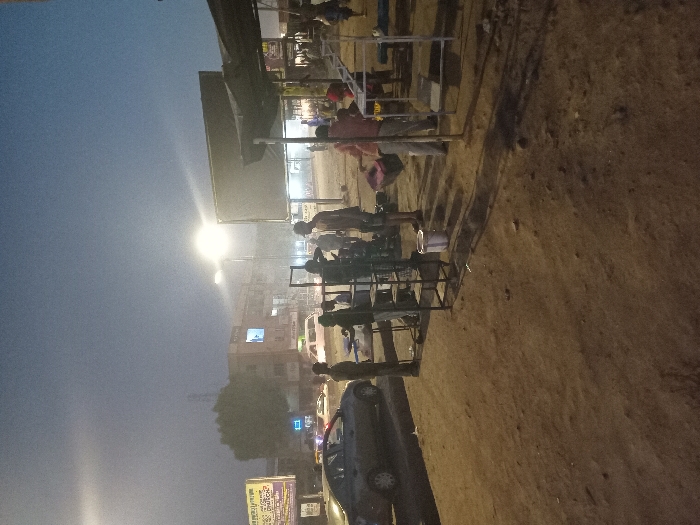 A nighttime scene shows a street with various people gathered around what appears to be a food stall or outdoor dining area. Cars are parked along the roadside. A bright street light illuminates the area. Buildings and signage are visible in the background. The ground is a mix of pavement and dirt. The sky is a dark blue or grey, suggesting dusk or night.