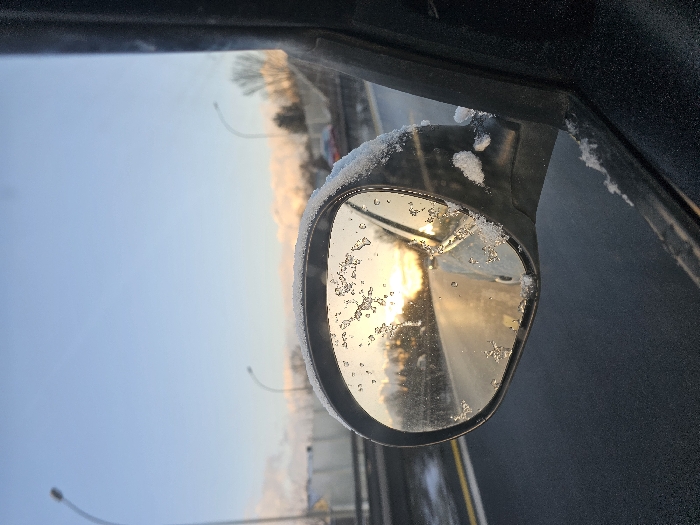 This image presents an exterior side mirror of a vehicle, viewed from inside the car, in Pontpierre, Luxembourg. The mirror's dark housing and glass surface are partially covered with white snow and ice crystals. The mirror reflects a low sun, which illuminates a wet or icy road surface and distant vehicles with a golden hue. Beyond the car's window, the background features a light-blue sky with warm-toned clouds near the horizon. Multiple curved streetlights and a multi-lane highway with a central barrier are visible. The asphalt road contains yellow lane markings, and snow is present on the ground adjacent to the highway. A faint red vehicle is observed in the distant traffic.