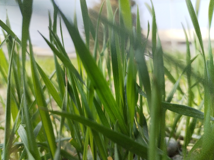 - "The image presents a low-angle, close-up perspective of numerous individual blades of green grass growing from the ground" by FM-F7Esh2, licensed under CC BY 4.0