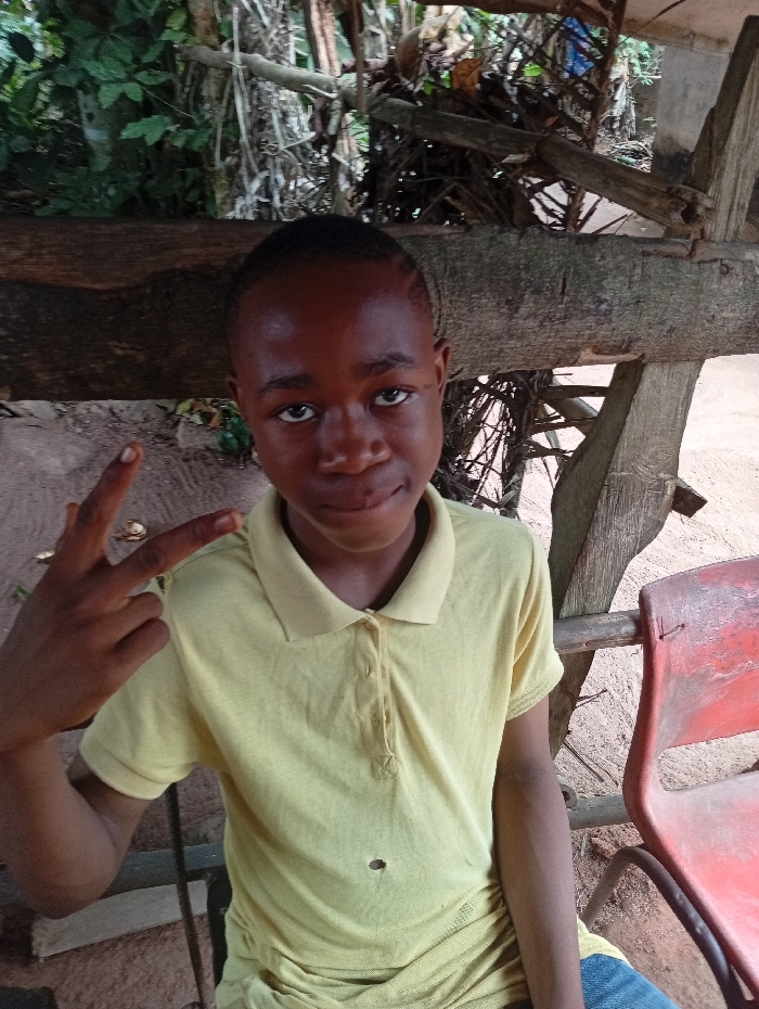 A young person poses outdoors, flashing a peace sign. They wear a yellow polo shirt with a small hole near the bottom. The background features rustic wooden beams and green foliage. A faded red plastic chair is visible to the right. The ground appears to be dirt.