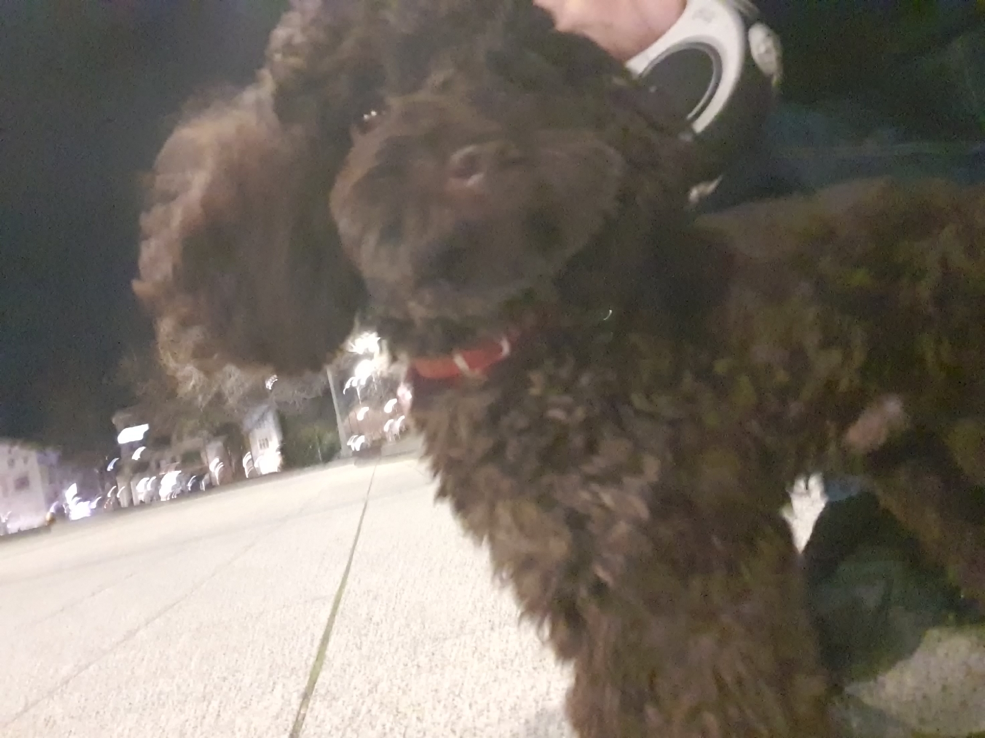 The image depicts a brown poodle on a leash at night