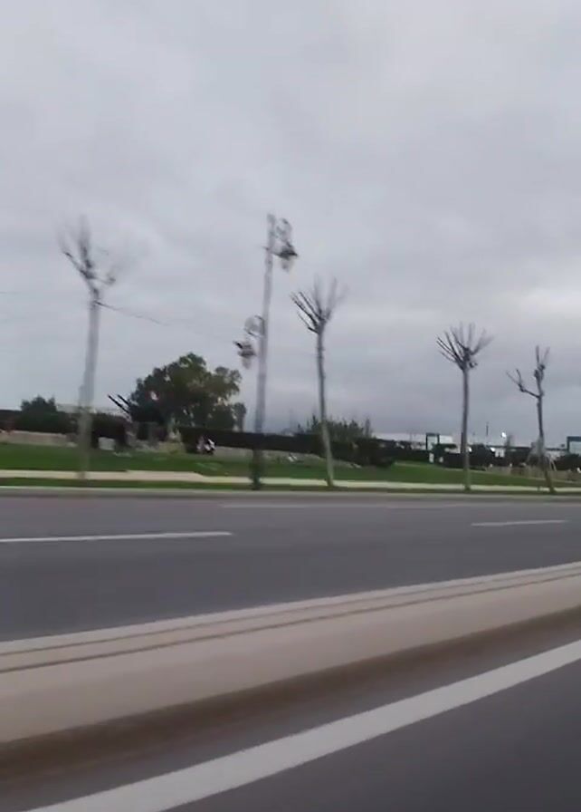 The camera is positioned at an angle to a road with a crosswalk. The scene is overcast with a grey sky. On the side of the road, there are trimmed trees and lampposts. Several vehicles pass on the road, including a blue car, a dark sedan, and a truck with food illustrations on its trailer. The scene appears to be filmed from a moving vehicle.