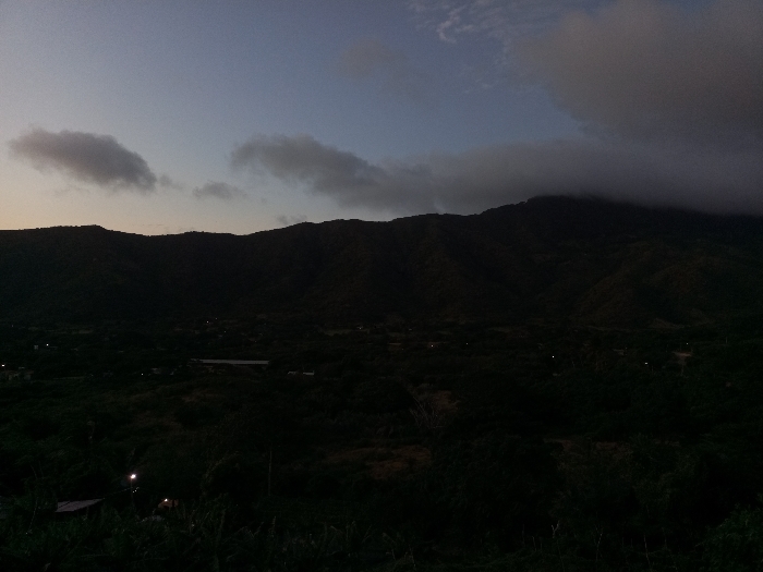 A dusky landscape depicts rolling hills and a large mountain, its peak obscured by heavy clouds. The sky transitions from a light blue at the horizon to a darker grey above. Below, a valley filled with dense vegetation and sparse settlements is visible, with only a few scattered lights breaking through the darkness. The overall scene conveys a sense of quiet solitude and the fading light of evening.