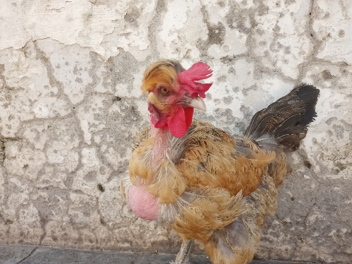 - "A Naked Neck chicken stands against a cracked, grey wall" by FM-GeBdt2, licensed under CC BY 4.0