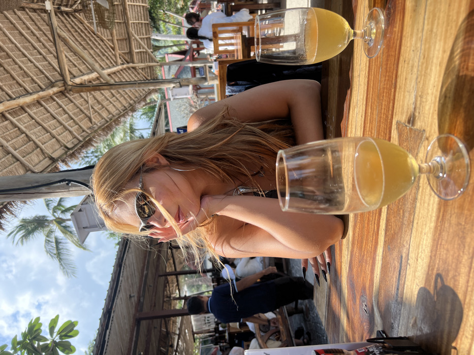 A woman with long blonde hair and sunglasses rests her chin on her hand at a wooden table. Two glasses containing a yellow liquid are on the table. The scene appears to be an outdoor restaurant with a thatched roof. Other people are visible in the background, some seated at tables. Palm trees and a partly cloudy sky are visible above the structures.