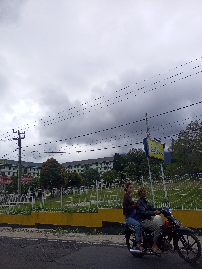 A motorcycle carrying two adults and a child drives on a road. A large building with a green roof sits in the background behind a fence. A sign is visible beside the road. Overcast skies fill the scene. Overhead power lines span the top of the image.