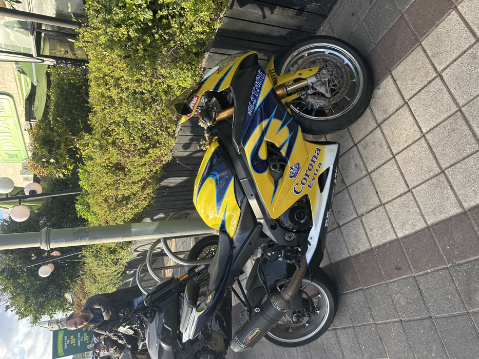 The image displays an outdoor street scene in Yakum, Israel, under daylight conditions. In the foreground, a paved sidewalk consists of alternating light and dark gray square tiles. A prominent yellow sport motorcycle, adorned with blue accents and "Corona Extra" branding including a crown logo on its side fairing, is parked centrally. This motorcycle features an Akrapovic exhaust system and Brembo front brakes. To its left, a dark-colored motorcycle, resembling a Ducati, is also parked. Further left, a bearded male, dressed in a dark jacket, stands near another motorcycle, partially obscured. A gray street light pole is positioned between the motorcycles and the background elements. The background is dominated by dense green hedges and bushes, situated behind a dark wooden fence. Above the foliage, a building with a light green awning is visible, displaying a sign with the Hebrew text "ארומה 1979" (Aroma 1979) and multiple white spherical light fixtures. A green street sign with numerical information is partially visible on the far left. The sky is partly cloudy.