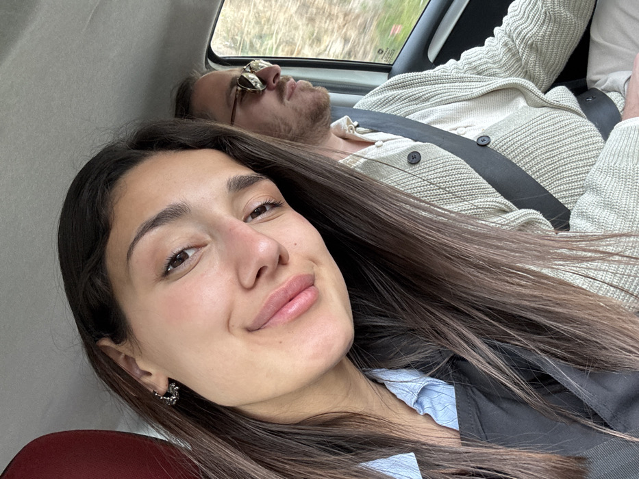 The scene depicts two individuals inside a moving vehicle in Mišići, Montenegro. In the foreground, a female subject with long, dark brown hair, fair skin, and a slight smile is captured, wearing a light blue collared shirt beneath a dark, possibly black, garment. A small, intricate earring is visible on her left ear. She is positioned as if taking a selfie. To her right and slightly behind her, a male subject is visible in profile, driving the vehicle. He wears amber-tinted, round sunglasses, a light-colored collared shirt, and a ribbed, light-colored button-up cardigan, secured by a black seatbelt. The exterior environment, viewed through the car window on the right, displays blurred green foliage, indicating vehicular motion. The car's interior features a light-colored headliner and a partial dark red headrest behind the female.