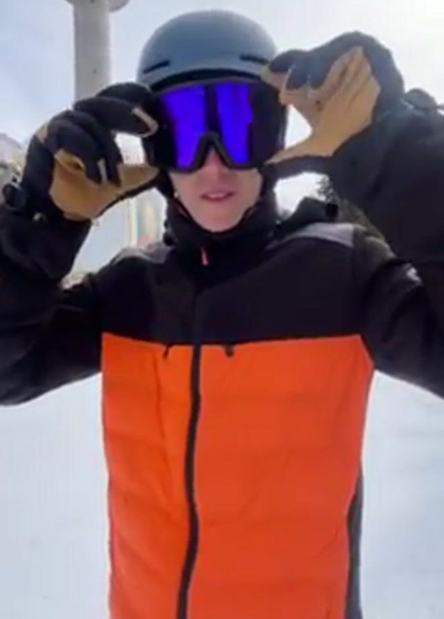 person standing in the snow, wearing a black and orange winter coat, a grey helmet, and purple ski goggles