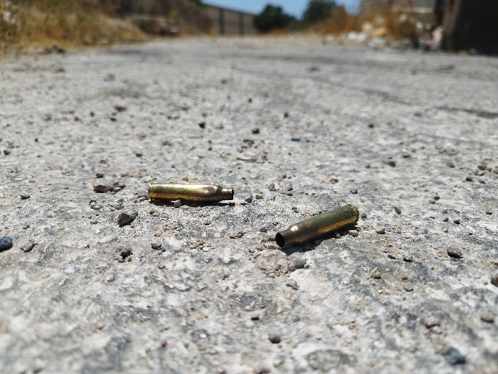 - "A low-angle, close-up photograph captures two spent brass-colored bullet casings resting on a textured, light-grey concrete or asphalt surface in the city of Unknown, Palestinian Territory" by FM-sbnkb2, licensed under CC BY 4.0