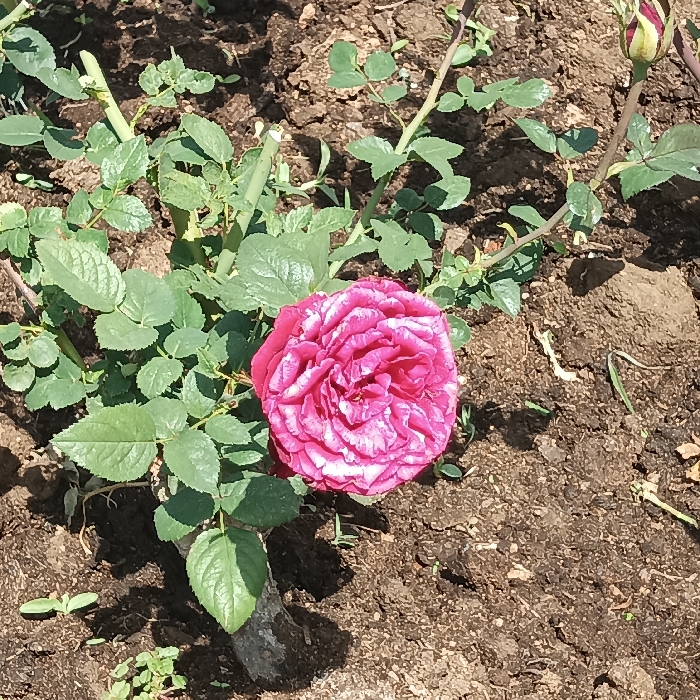 The image displays a vibrant, fully bloomed rose, approximately 10-12 cm in diameter, centered on a small rose bush. The flower exhibits a deep magenta-pink color with distinct lighter pink or white variegation, particularly noticeable on the petal edges and veins. Surrounding the blossom are numerous green, serrated rose leaves, indicating healthy foliage. A single, unopened reddish-pink rose bud is visible on a thin stem extending from the upper right quadrant of the frame. The rose bush is rooted in dark brown, somewhat clumpy soil, sparsely populated with small green sprouts. The scene is illuminated by direct sunlight, casting defined shadows beneath the leaves and flower. This observation was recorded in Barakin Sabawa, Nigeria.