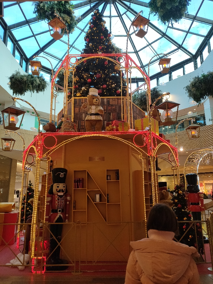 The image displays a large, multi-tiered Christmas decoration exhibit located within the Centre Commercial Place des Halles in Strasbourg, France. The environment is a brightly lit indoor space with a distinctive glass-paneled, geometric ceiling framework. The central feature is a tall Christmas tree adorned with red and gold baubles and warm white lights, set against a backdrop designed to resemble bookshelves. Below this, on an elevated platform, a prominent plush teddy bear figure, dressed in a white hat and gold-trimmed uniform, is positioned. Surrounding the bear are various wrapped gift boxes in red and yellow, a small sack labeled "Joyeux Noël," and a smaller teddy bear. This platform is outlined with red and gold string lights. Beneath the platform is a golden-yellow structure, configured as a small house or kiosk, featuring built-in shelves containing books, with the words "best-sellers" visible above one section. The entire display is framed by tall, arching metallic structures decorated with warm white string lights and multiple suspended lanterns emitting a warm glow. Two large Nutcracker soldier figures, painted red and black, stand at the base of the main structure, which is enclosed by a golden barrier. The immediate floor around the display is covered in a red material. In the foreground, an individual with short, dark hair, wearing a light pink or beige puffer jacket and a matching turtleneck, is seen from behind, facing and observing the Christmas display. Overhead, decorative green foliage hangs from the ceiling's metal structure. The background reveals additional levels and retail areas of the shopping center.