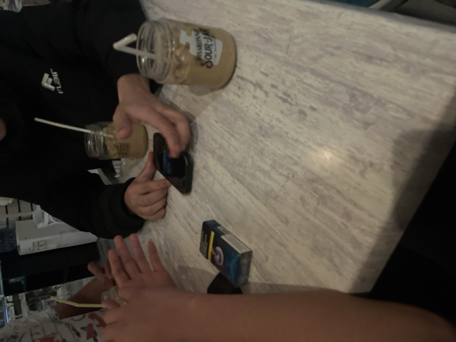 The image captures an indoor scene at a casual establishment in Stara Zagora, Bulgaria. The primary focus is a light-colored, possibly laminate, tabletop where at least two individuals are present. On the left, a tanned right arm, dressed in a white shirt with a dark pattern, rests with an open palm on the table. Opposite, a second individual, wearing a black long-sleeved garment with a white "Flair" logo on the chest, is actively interacting with a black smartphone placed centrally on the table. Both hands of this individual are positioned around the device. To the left of the smartphone, a blue and black cigarette pack is visible on the table. Two identical clear glass jars, each containing a light brown, frothy beverage with a white plastic straw, are also on the table. The jar closer to the viewer is labeled "DISARONNO SOUR-JAR." The background elements are out of focus, showing indistinct indoor furniture or equipment, suggesting an artificial light source.