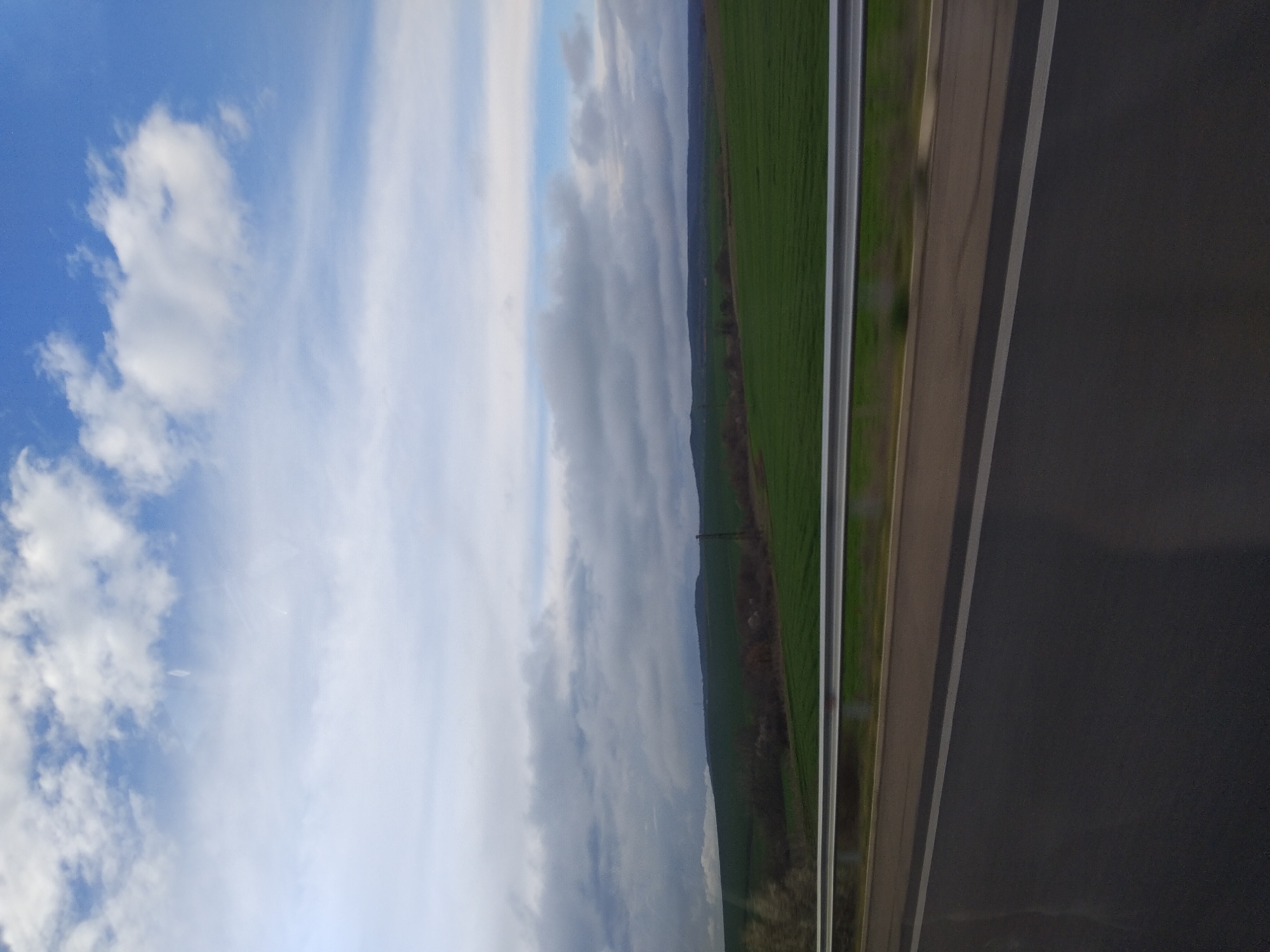 The image displays an exterior rural landscape scene, captured from a low perspective, likely from a moving vehicle, in the vicinity of Troyanovo, Bulgaria. The upper half of the frame shows a dynamic sky, transitioning from patches of clear blue with sparse white cumulus clouds at the very top to a predominant expanse of dense, grey stratocumulus clouds extending across the mid-sky and horizon. Below the cloud layer, the landscape features gently rolling hills covered with vibrant green vegetation, characteristic of agricultural fields, extending into the distance where darker, tree-lined hills are visible. A single dark utility pole stands vertically in the mid-ground on the right side, amidst scattered trees and shrubs. In the foreground, a dark asphalt road surface occupies the bottom quarter of the image, featuring a continuous white lane marker. A reflective, silver-colored metal guardrail, supported by dark posts, traverses horizontally across the lower-mid section of the frame, positioned between the road and the adjacent cultivated fields. No human figures or discernible activities are present. The lighting is diffuse, consistent with an overcast or partly cloudy day.