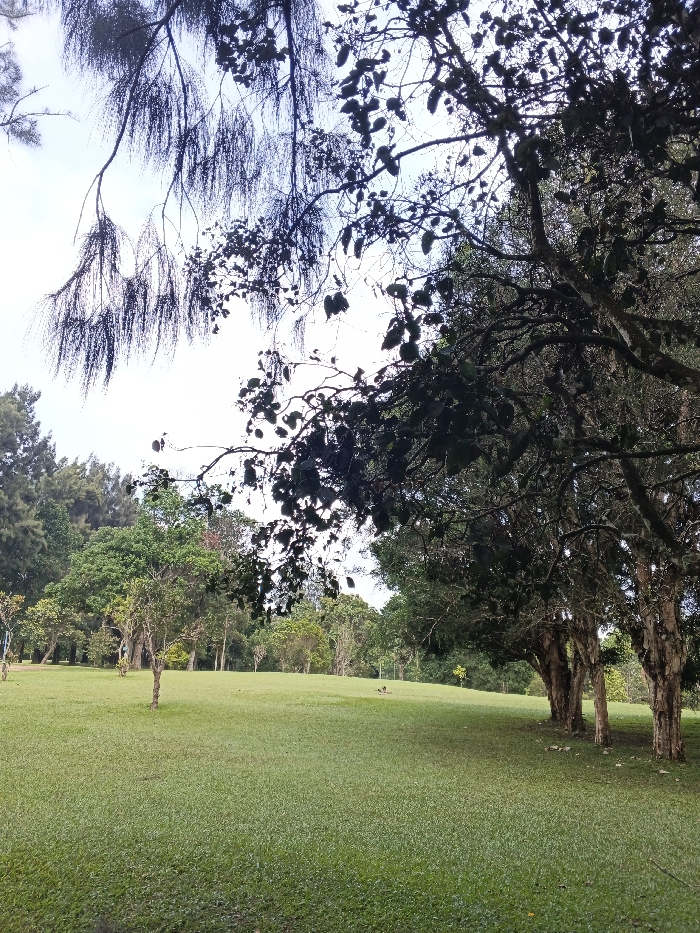The image displays an outdoor scene in Masulog, Philippines, characterized by a natural, park-like environment under an overcast sky. The lower two-thirds of the frame are dominated by a vast expanse of well-maintained, short-cut green grass, gently sloping upwards towards the background. No individuals or specific objects are visible on the grass. A prominent row of mature trees with rough, textured trunks and dense foliage occupies the right side of the frame, extending from the mid-ground. Scattered smaller trees with distinct canopies are present across the grassy field in the mid-ground. The background consists of a dense forest line, featuring various species of trees and forming a solid green backdrop. The upper portion of the image reveals a light, cloudy sky, partially obscured by the dark silhouettes of overhead tree branches and leaves. One set of branches in the upper left exhibits fine, drooping, needle-like foliage.