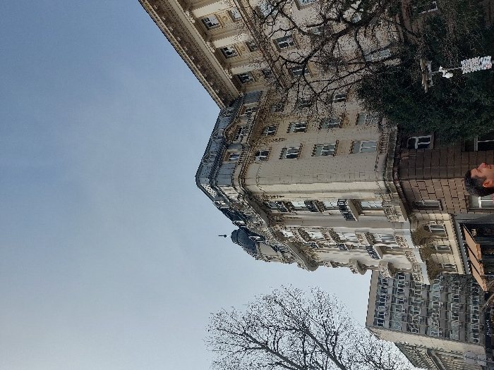 The image depicts an urban landscape in Sofia, Bulgaria, specifically at Knyaz Aleksandar I Square. The upper two-thirds of the frame are occupied by a clear, light blue sky. The central subject is the multi-story Ministry of Defence building, located on the right half of the frame. It features an ornate, light-colored facade with numerous windows, decorative elements, and balconies with black railings. A distinctive dark grey mansard roof with dormer windows tops the structure, culminating in a small, dark, domed turret at its visible corner. The lower portion of this building presents a darker, possibly stone, cladding at street level, where a brown commercial awning is visible. To the immediate right of the Ministry of Defence building, partially visible along the right edge, is a segment of the National Assembly of Bulgaria building (the former Party House), characterized by its classical architectural style with visible columns and a light-colored facade. To the far left, a modern, multi-story building with a grid-like pattern of windows and numerous visible air conditioning units occupies the background. Vegetation includes the bare branches of a large deciduous tree extending from the left foreground into the upper left quadrant. Additional bare tree branches partially obscure the upper right side of the scene. A dense, dark green evergreen shrub is visible in the lower right foreground. The upper portion of an adult male's head and right shoulder are visible in the lower foreground, positioned slightly to the right of the center. He has short, dark hair and is depicted in profile, looking towards the right side of the frame. A utility pole with some attached signs or posters is partially visible behind the evergreen vegetation in the lower right. The scene is illuminated by daylight.