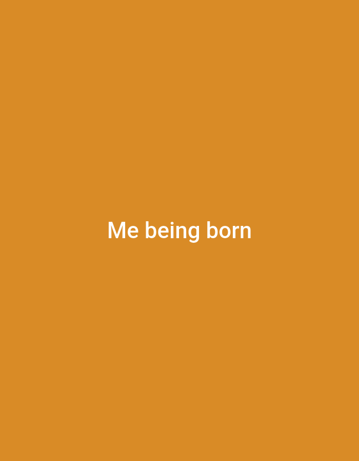 The image displays a solid orange background. White, sans-serif text is centered horizontally, reading "Me being born." No discernible people, objects, actions, or specific environmental features are present. The location in Oklahoma City, United States, is not discernible from this image.