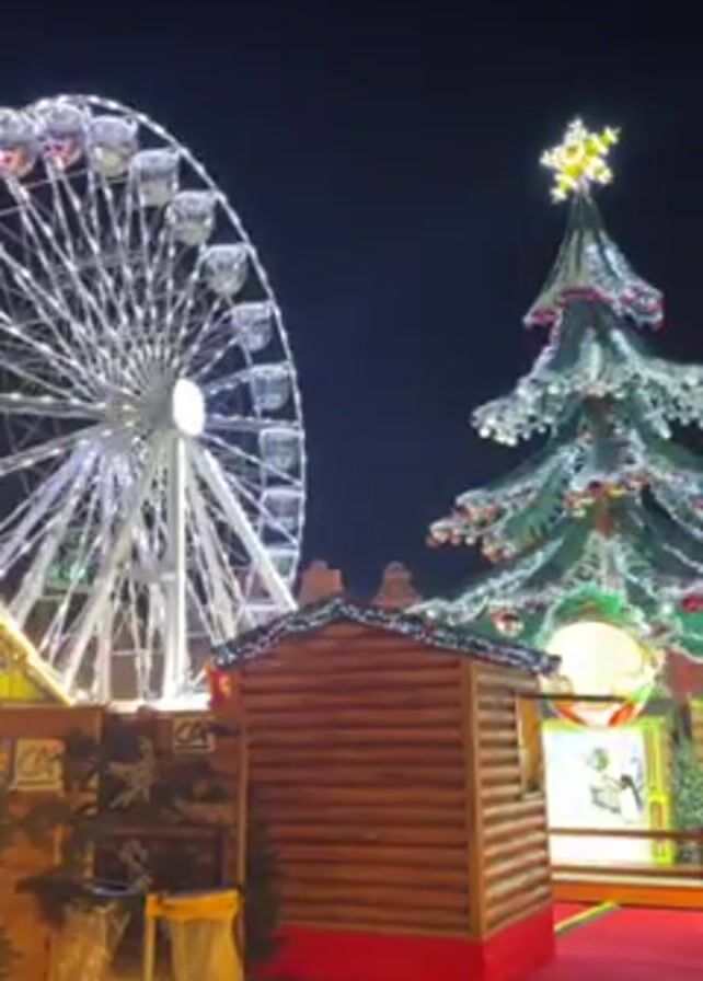 The video captures a nighttime scene featuring a Ferris wheel and a large Christmas tree adorned with lights
