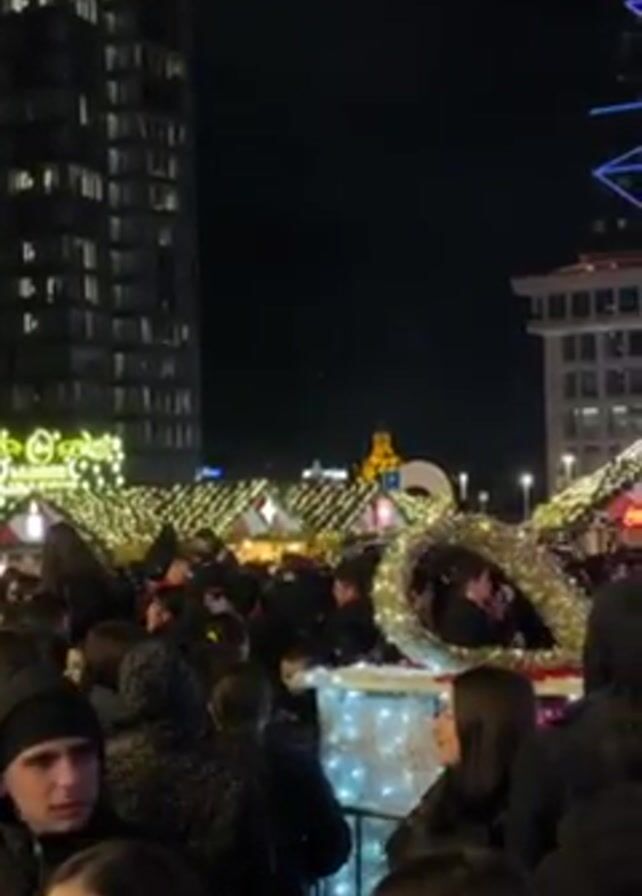 bustling outdoor scene at night. The location appears to be a Christmas market in a city square. Many people are milling around. There are numerous small, brightly lit booths selling goods. A large, decorative moon-shaped structure illuminated with lights stands out in the foreground. In the background are modern buildings and a glimpse of what appears to be an older, golden-domed structure. A tall, metal structure is visible to the right, potentially part of a stage or light system. Most people in the crowd are wearing dark clothing suitable for cold weather. The general atmosphere is festive and crowded.