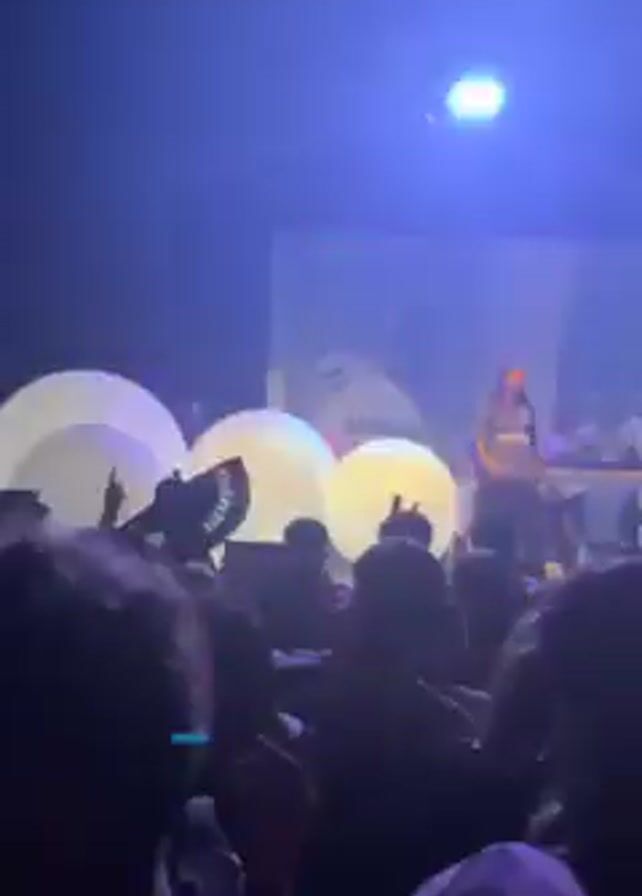 concert or performance from the perspective of someone in the audience. The crowd is dense, with many people visible in silhouette. The stage is lit with bright spotlights in shades of green and blue. Several large, round balloons or spheres are placed in front of the stage, glowing with a soft light. On stage, performers are visible, including what appears to be a DJ setup. A large screen behind the performers displays abstract visuals. The audience is engaged, some raising their hands or phones in the air.