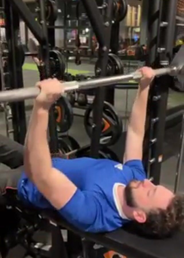 - "A man in a blue shirt lies on a bench, using a barbell in a Smith machine to perform a bench press in a gym" by FM-DELcs2, licensed under CC BY 4.0