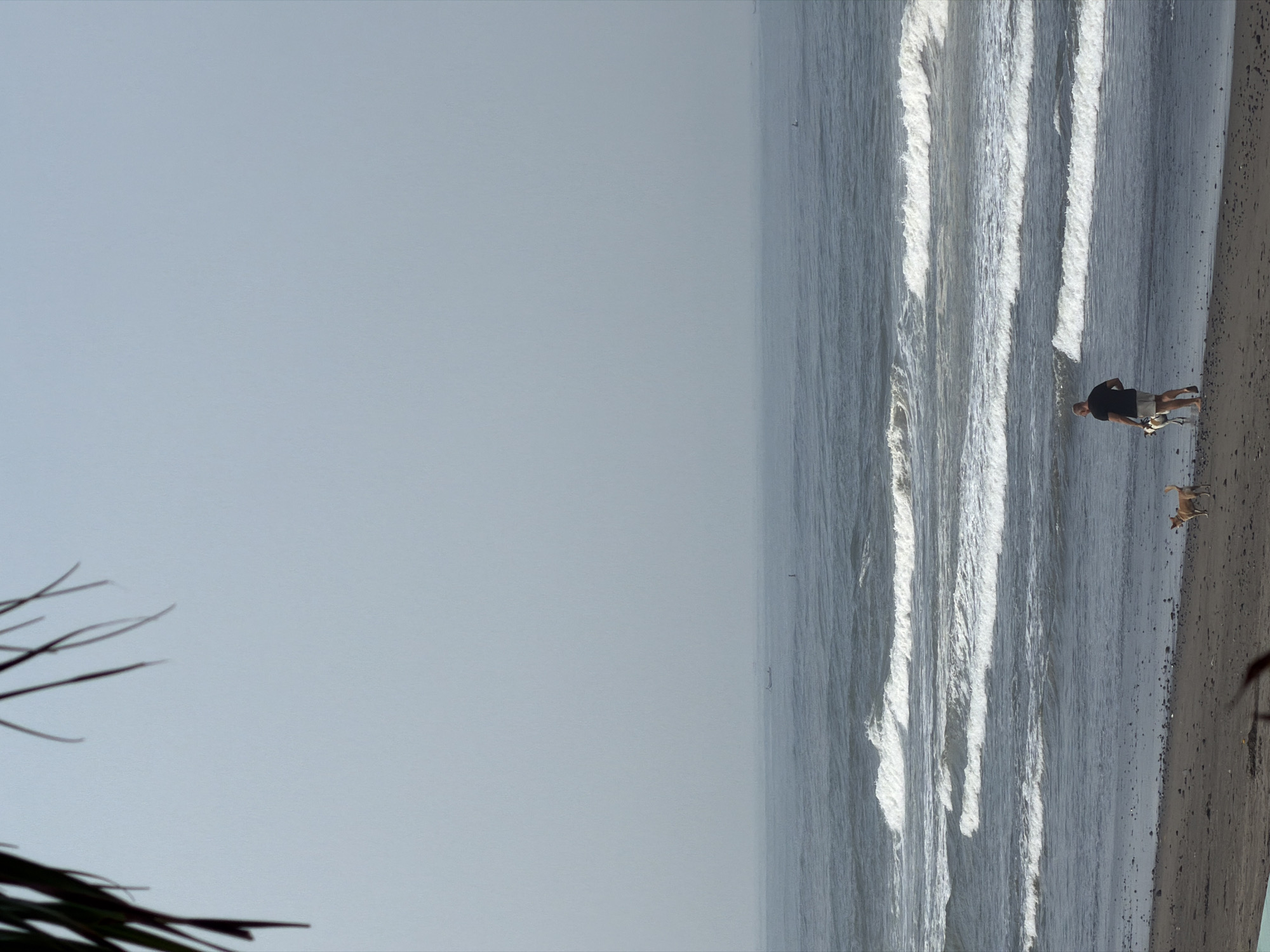 The image depicts a beach scene in Belalang, Indonesia, under an overcast, light gray sky. An adult male is observed from behind, walking barefoot from left to right along the dark sand shoreline, near the breaking waves. He wears a dark t-shirt and light-colored shorts. A medium-sized dog, predominantly white with tan markings, is on a leash held by the man, walking close to his left side. A smaller, tan-colored dog walks freely a few paces ahead and to the left of the man and the leashed dog. The ocean features multiple parallel lines of white-capped waves breaking towards the dark, pebble-strewn beach. In the distant, hazy ocean, a small, dark boat and a dark vertical buoy are visible. Dark, out-of-focus foliage partially obscures the upper left corner of the frame.