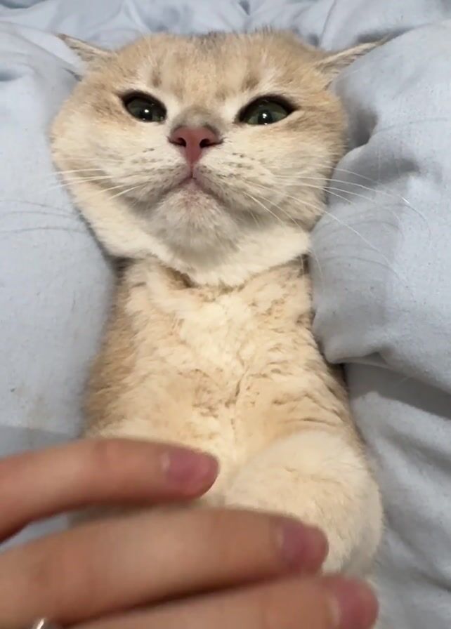 A hand holds up one of the paws of a tan-colored cat that is laying on its back on a light blue bed