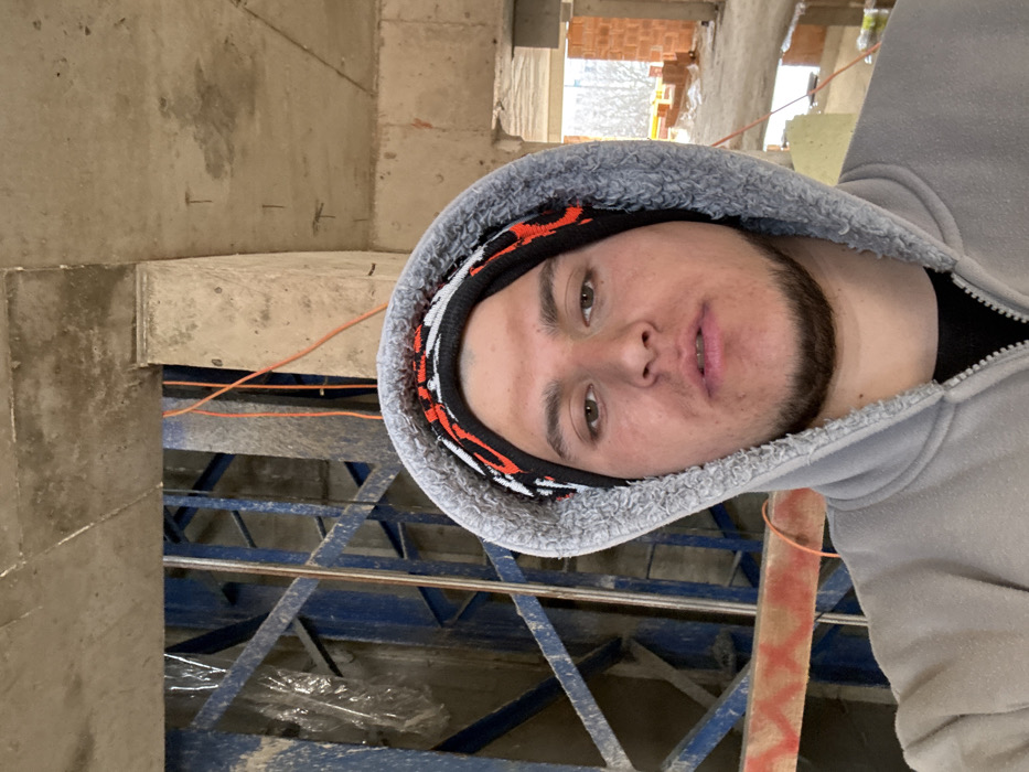 The image displays a young adult male, appearing to be in his late teens or early twenties, situated within a building under construction in Varna, Bulgaria