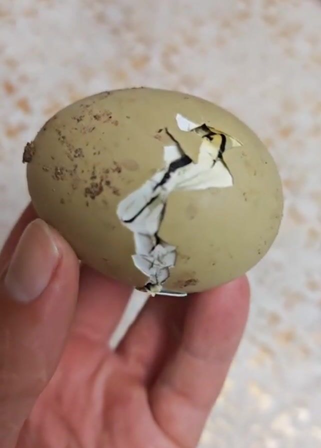 - "A hand holds a light brown egg with cracks in it, revealing white shell fragments and a glimpse of a dark interior, presumably a chick" by FM-cLarj2, licensed under CC BY 4.0